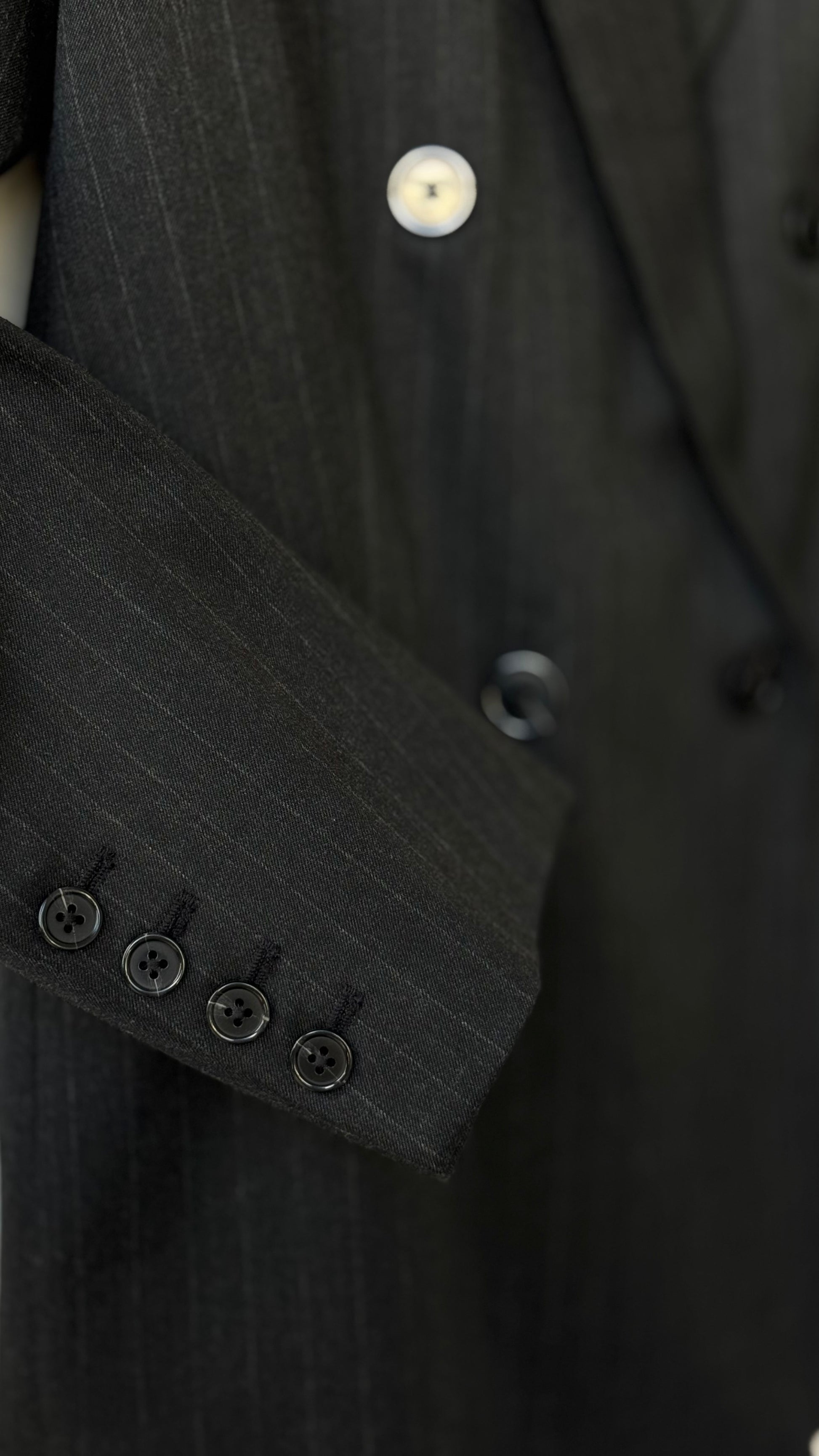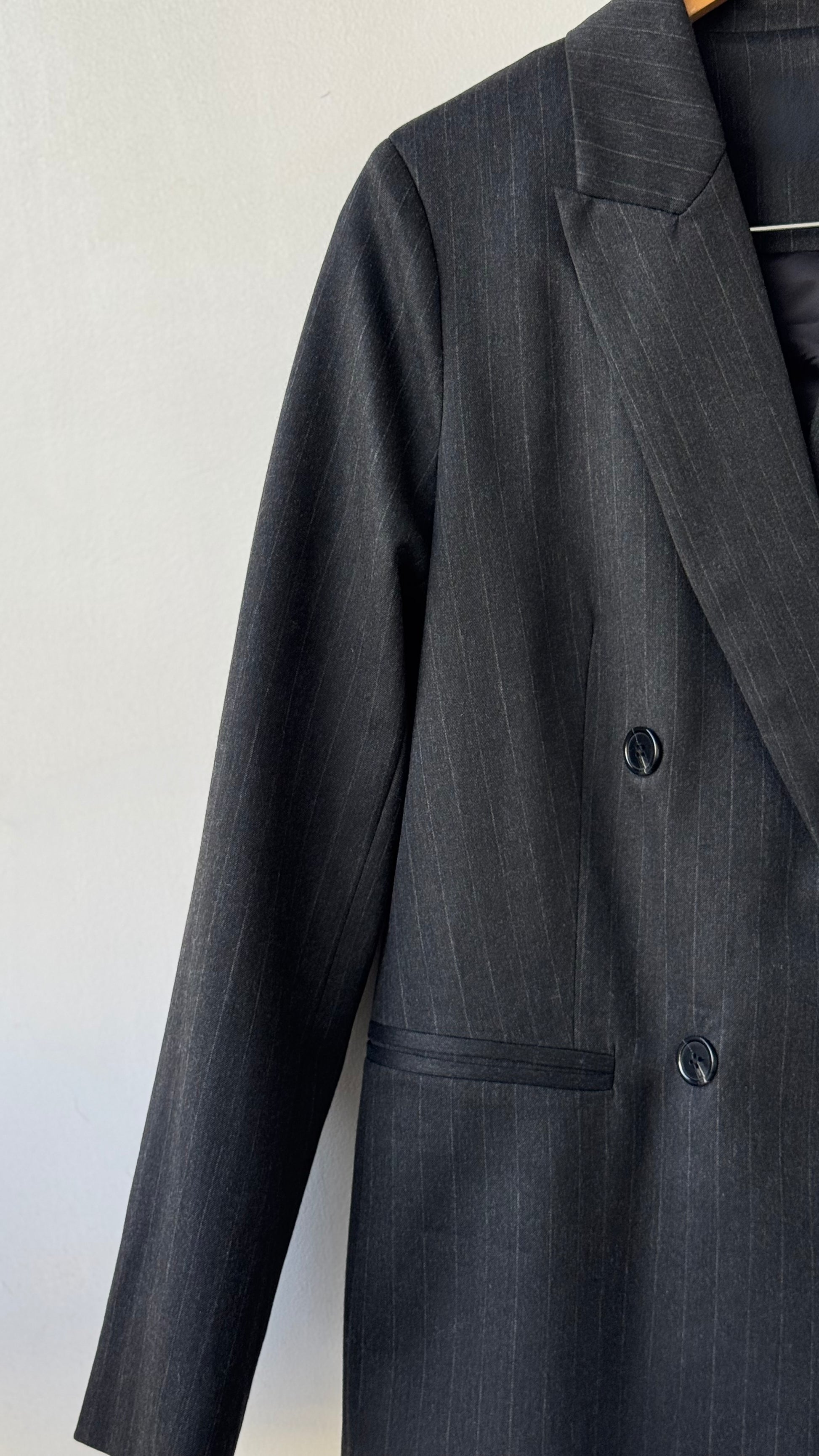 Blazer gris foncé avec rayures blanches fines, col à revers et manches longues avec épaulettes. Poches passepoiles sur le devant. Doublure intérieure. Fermeture avant avec boutons et fente arrière.