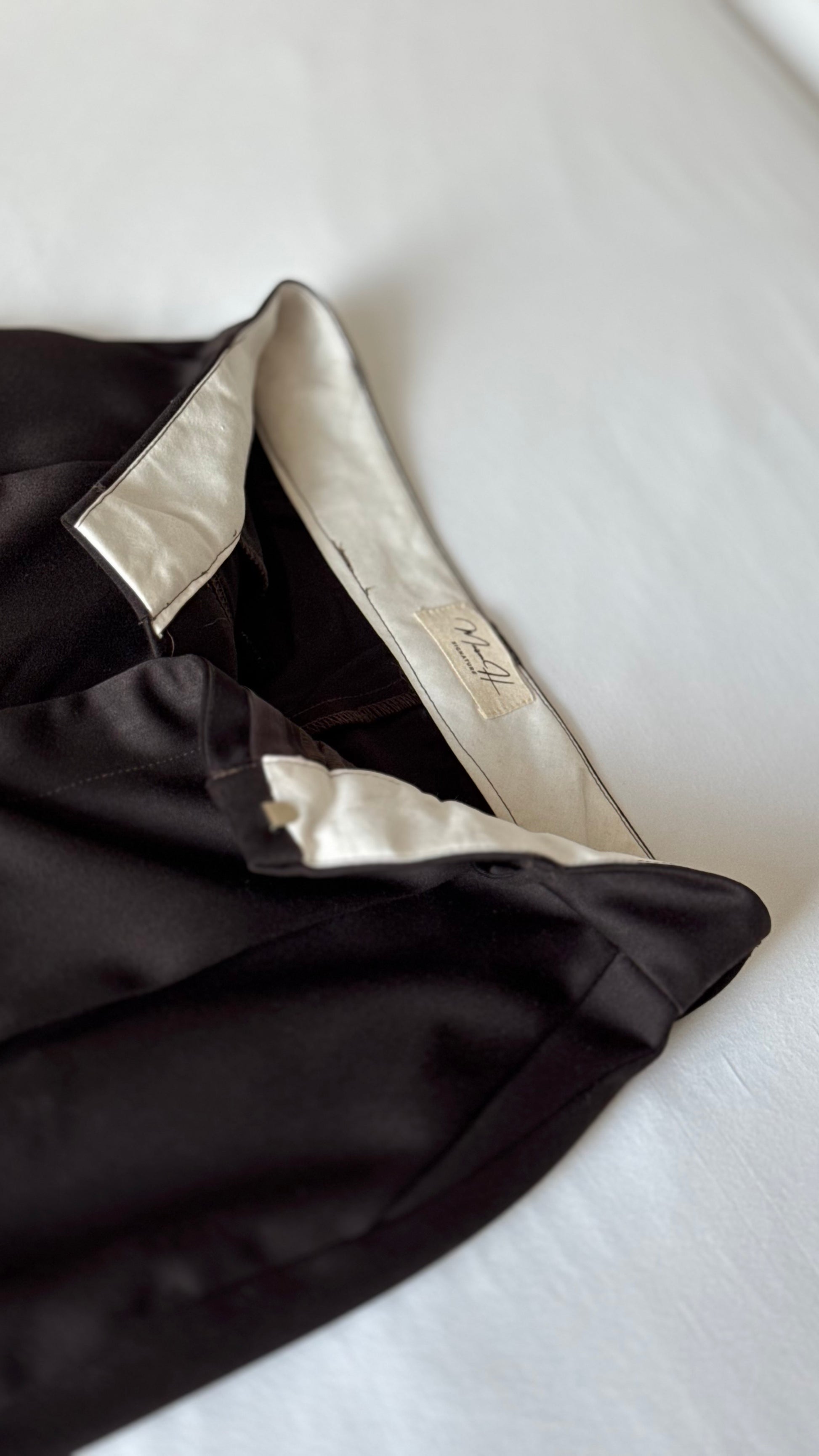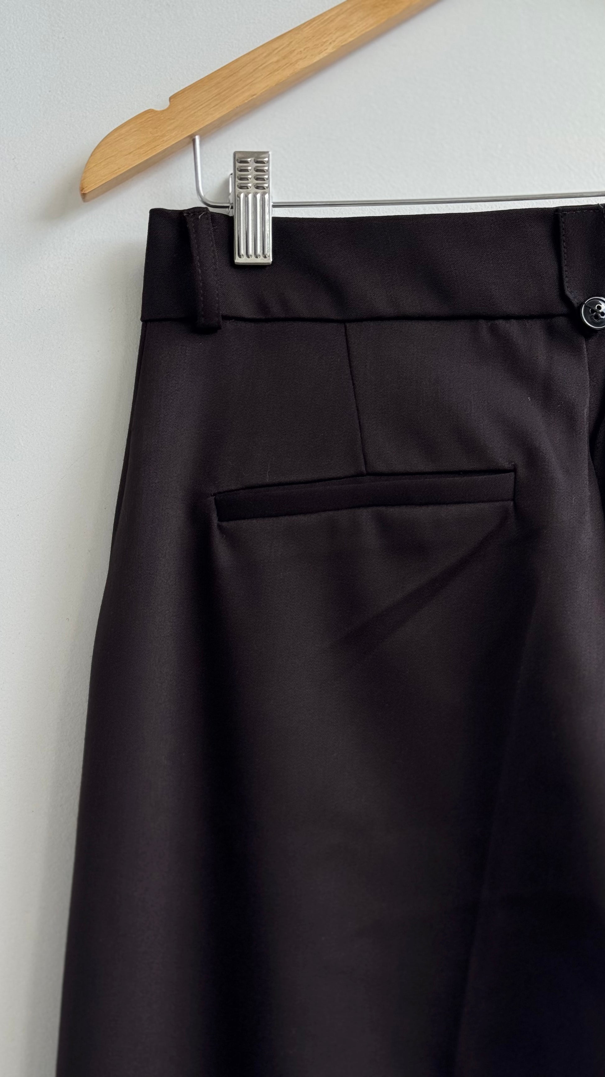 Pantalon à pinces, fermeture métallique, détail intérieur tour de taille en tissu blanc, détails bouton arrière, poches passepoiles arrières, poches latérales devant, coupe droite large.