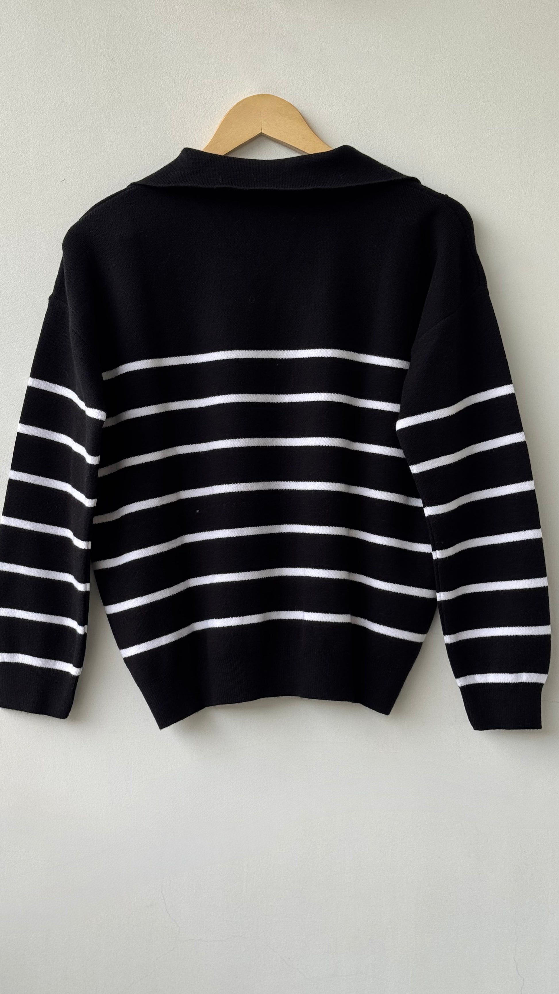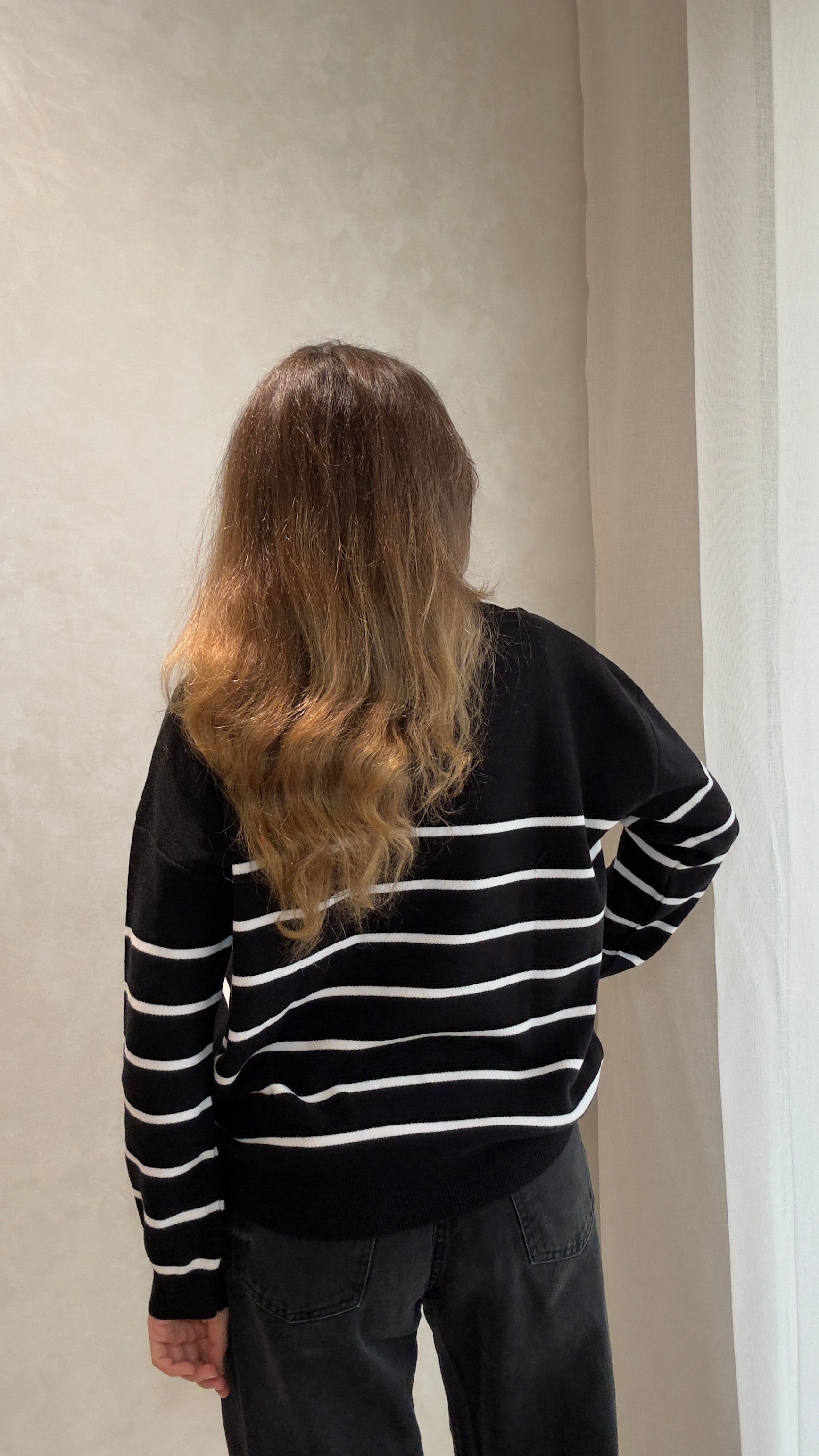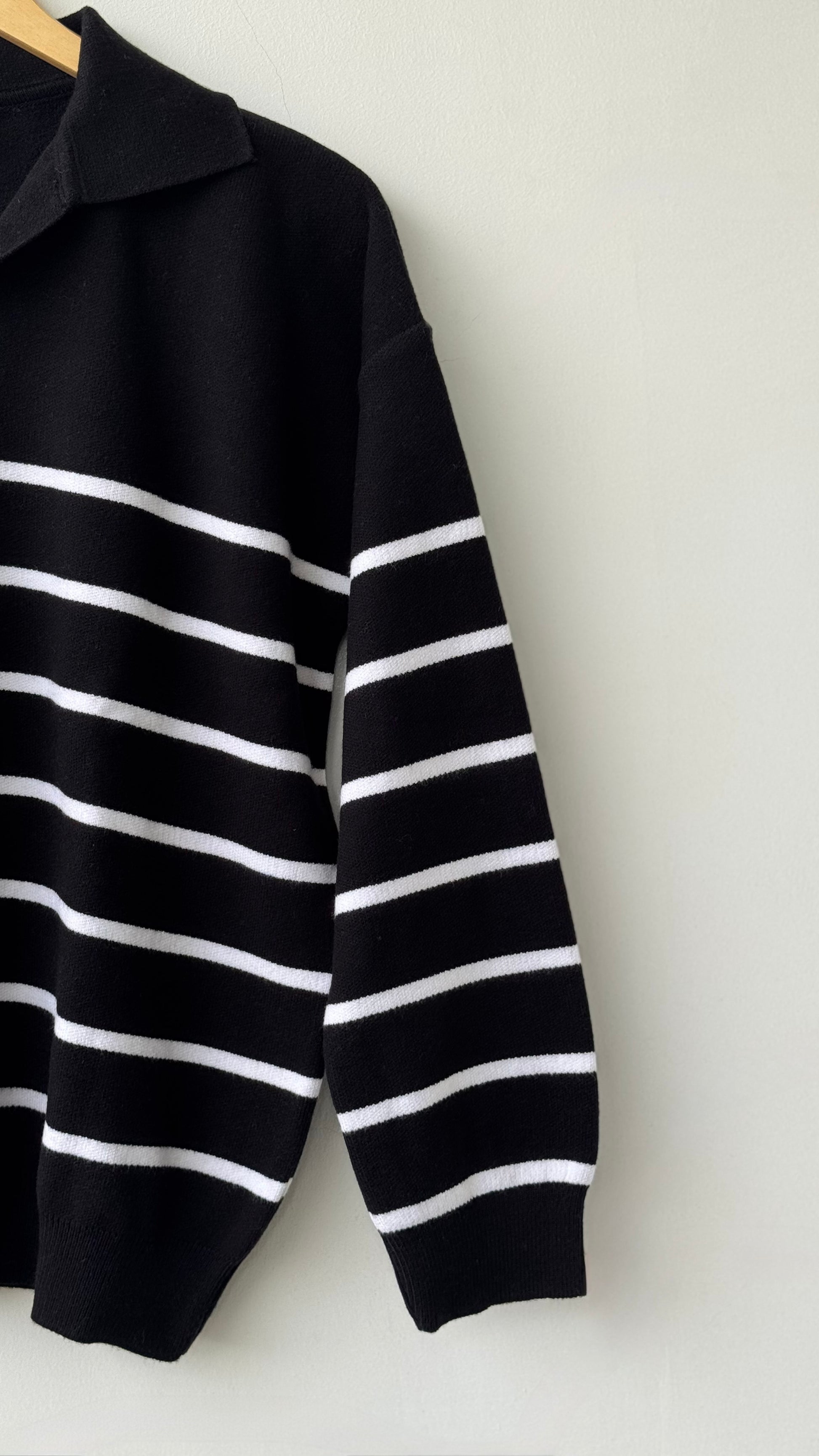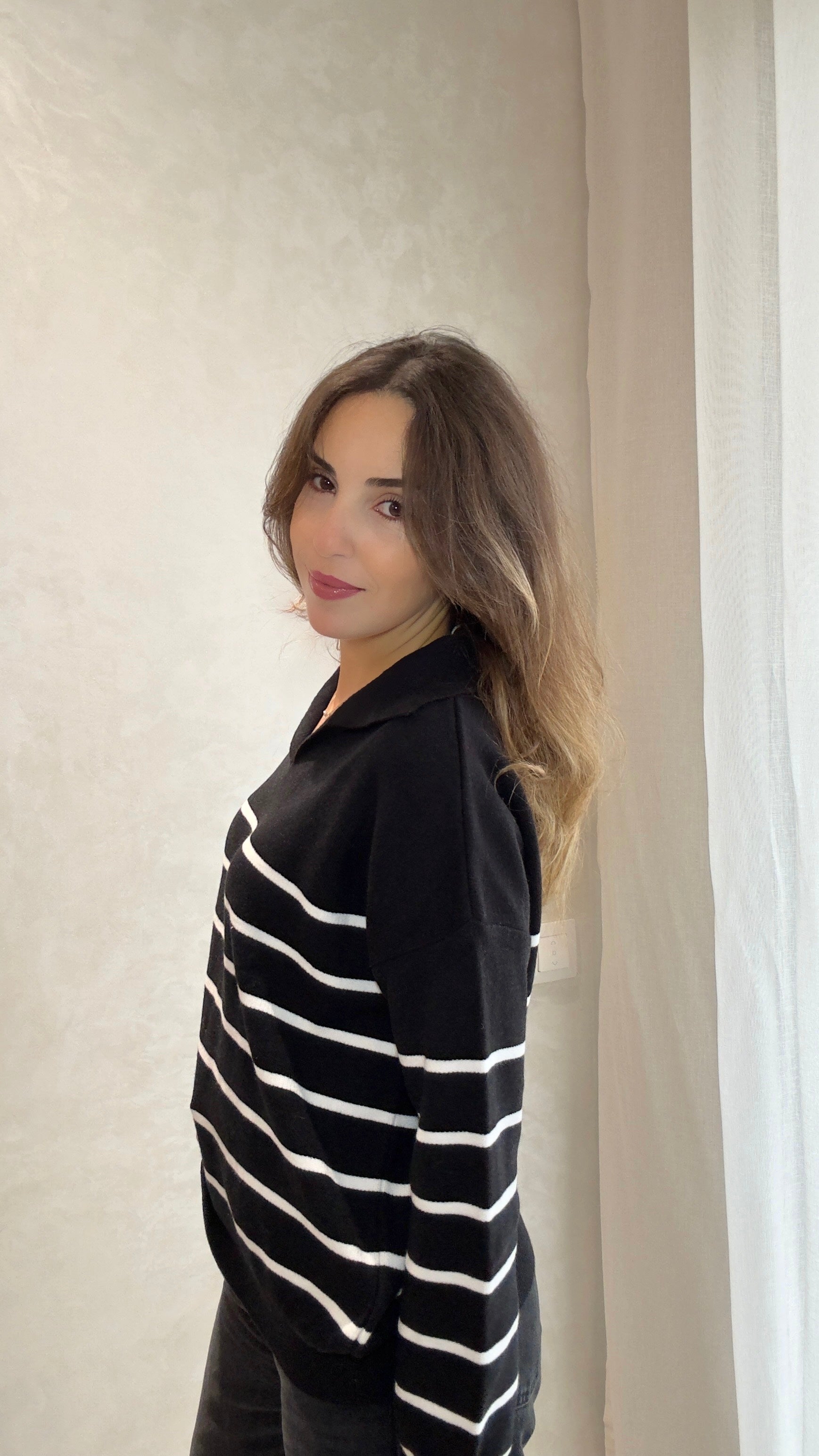 Pull col rond en Maille douce et lisse aux finitions côtelées. Noir rayé en blanc. Style Oversize.