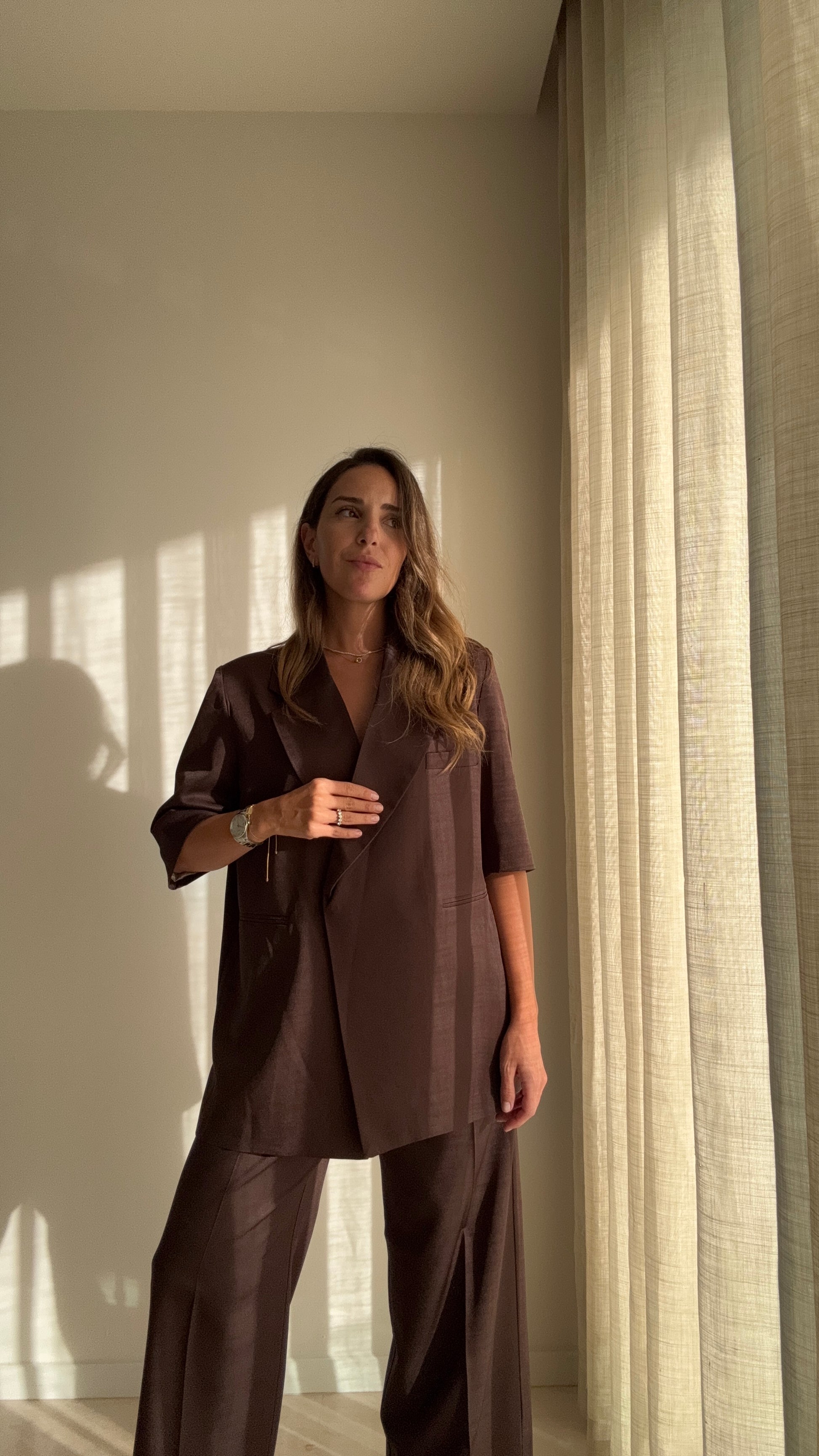Tailleur composé d'une veste demi manches de style Oversize à bouton croisée, épaulettes et 3 poches, avec fentes sur les cotés. et doublure intérieure en satin.