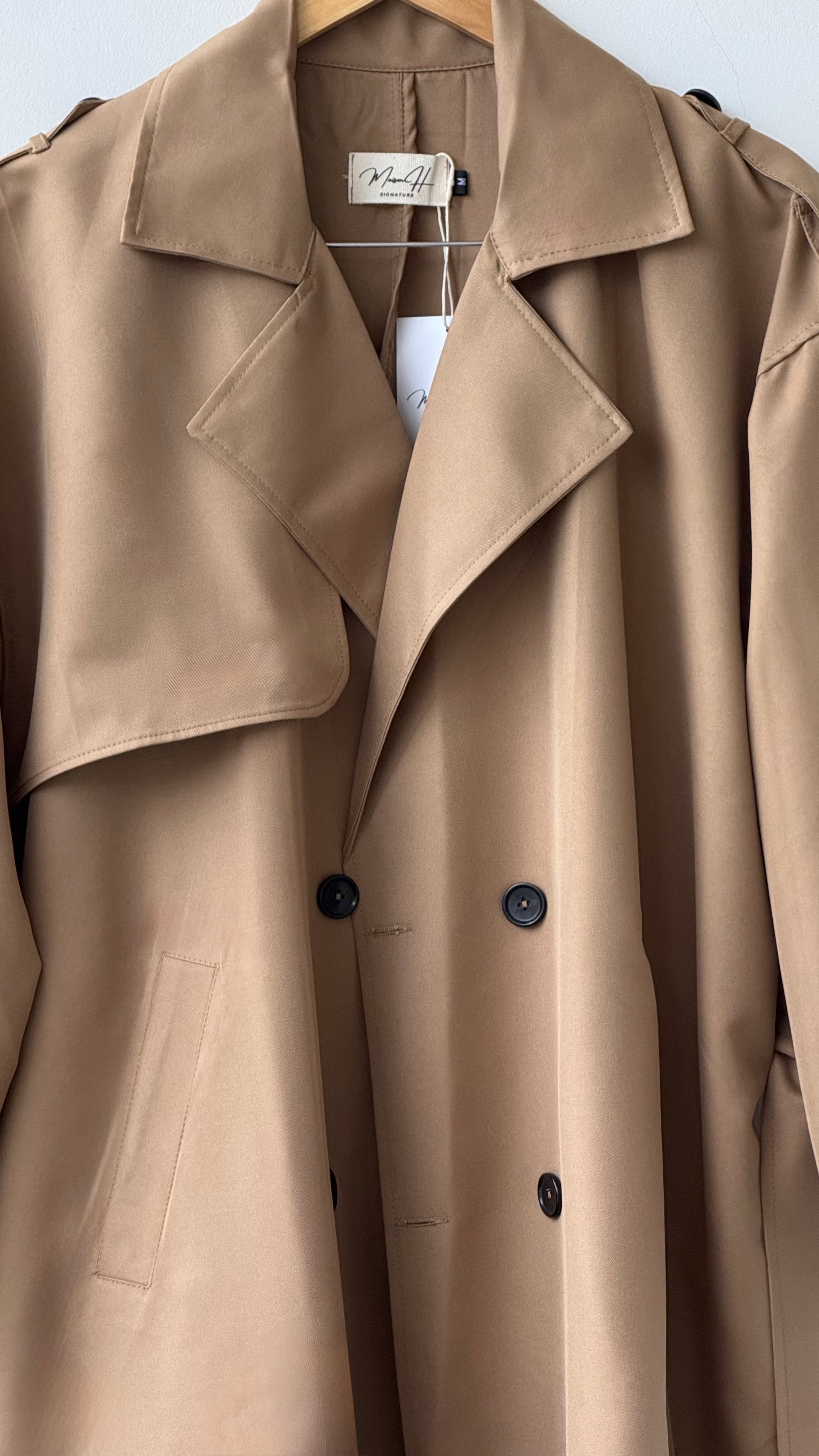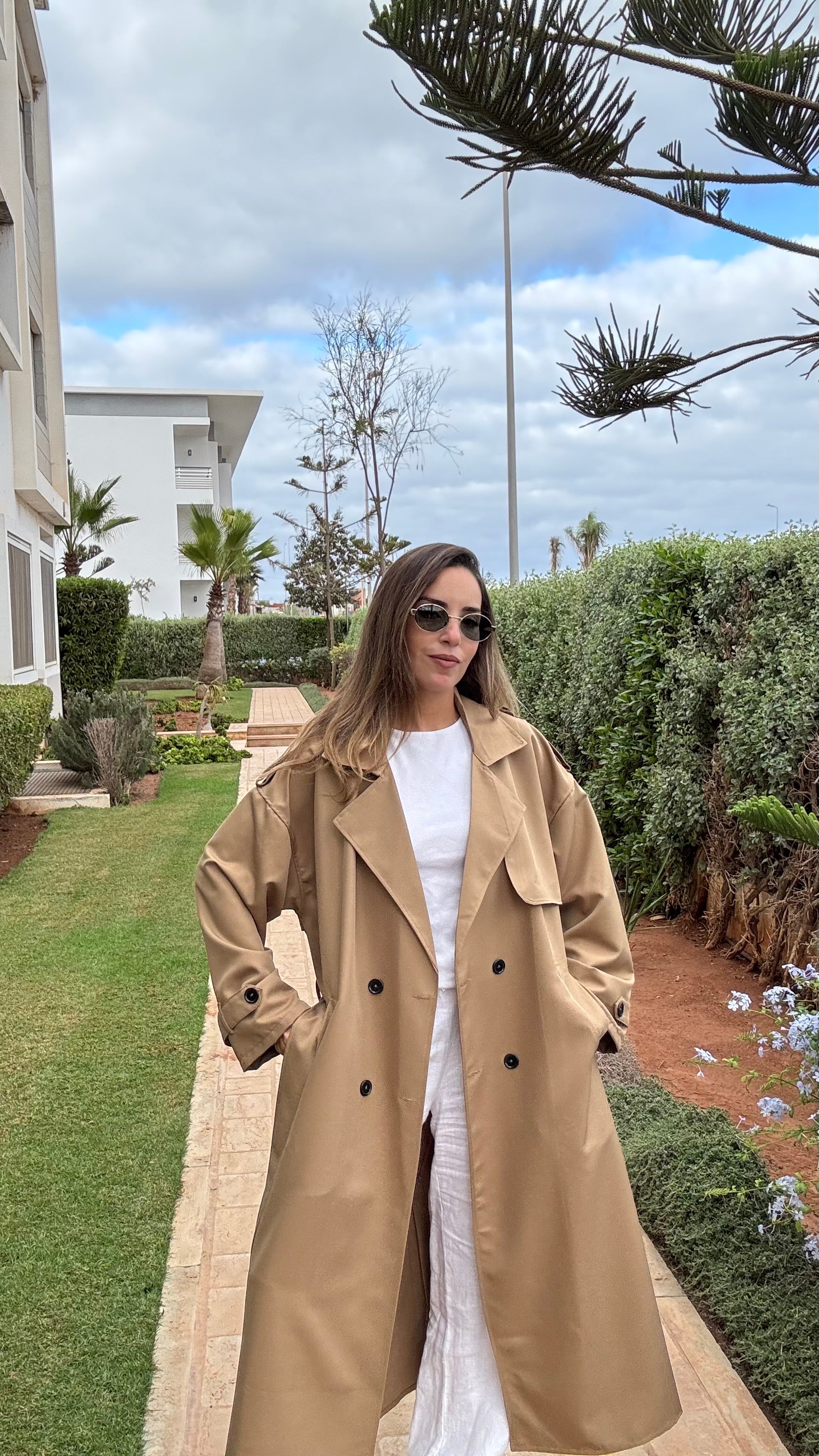 Trench avec col à revers et manches longues. Finitions avec pattes. Poches avant passepoilées. Bas avec ouverture dans le dos. Fermeture croisée sur le devant avec boutons et ceinture en tissu assorti.